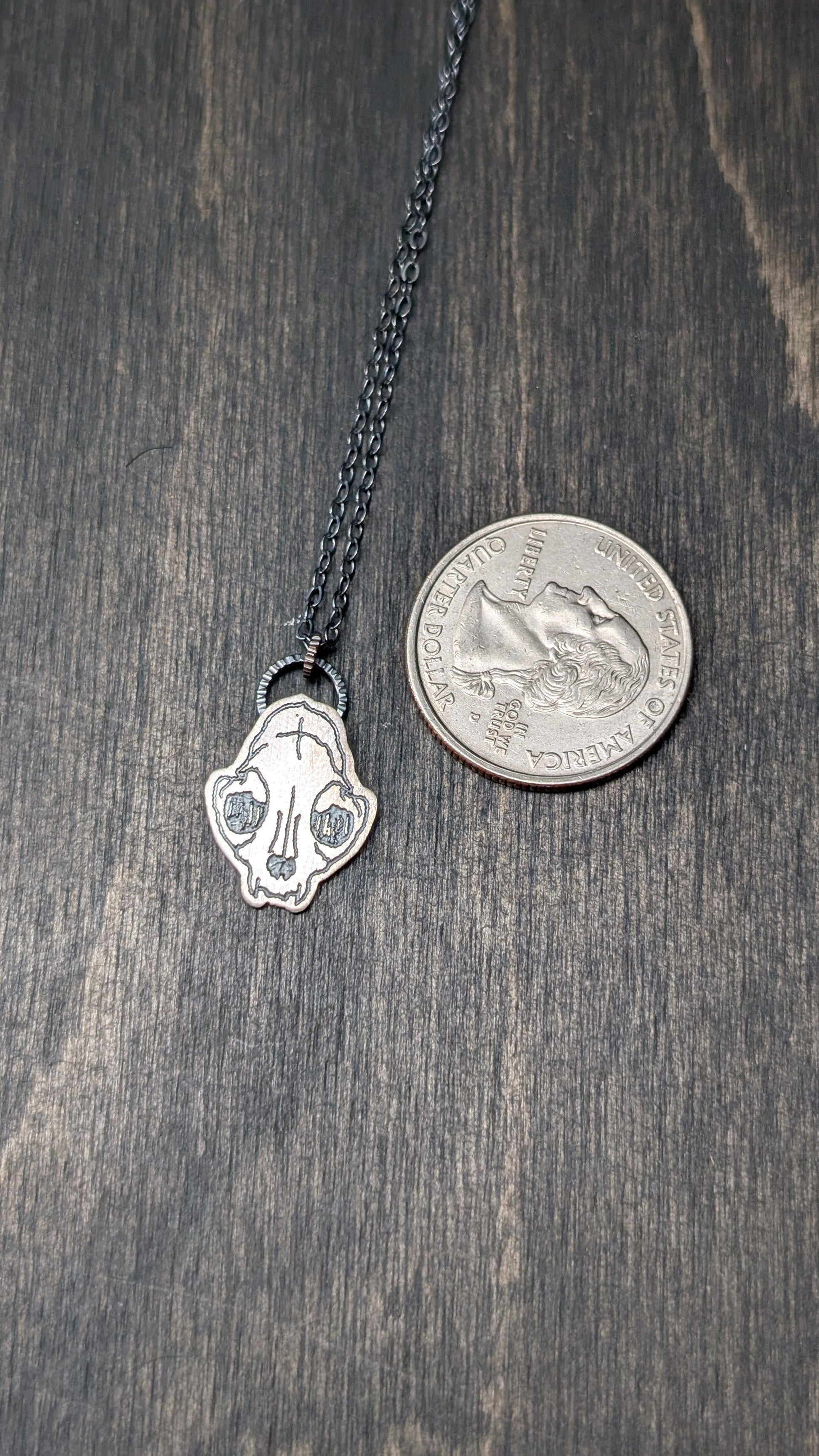 This cat skull necklace is perfect for any oddities collector or lover of things weird! The skull drawing is acid etched into the silver. It is then oxidized and brushed to make the image pop! It hangs on oxidized hand textured rings and oxidized 16-18in sterling silver chain with handmade s hook clasp.