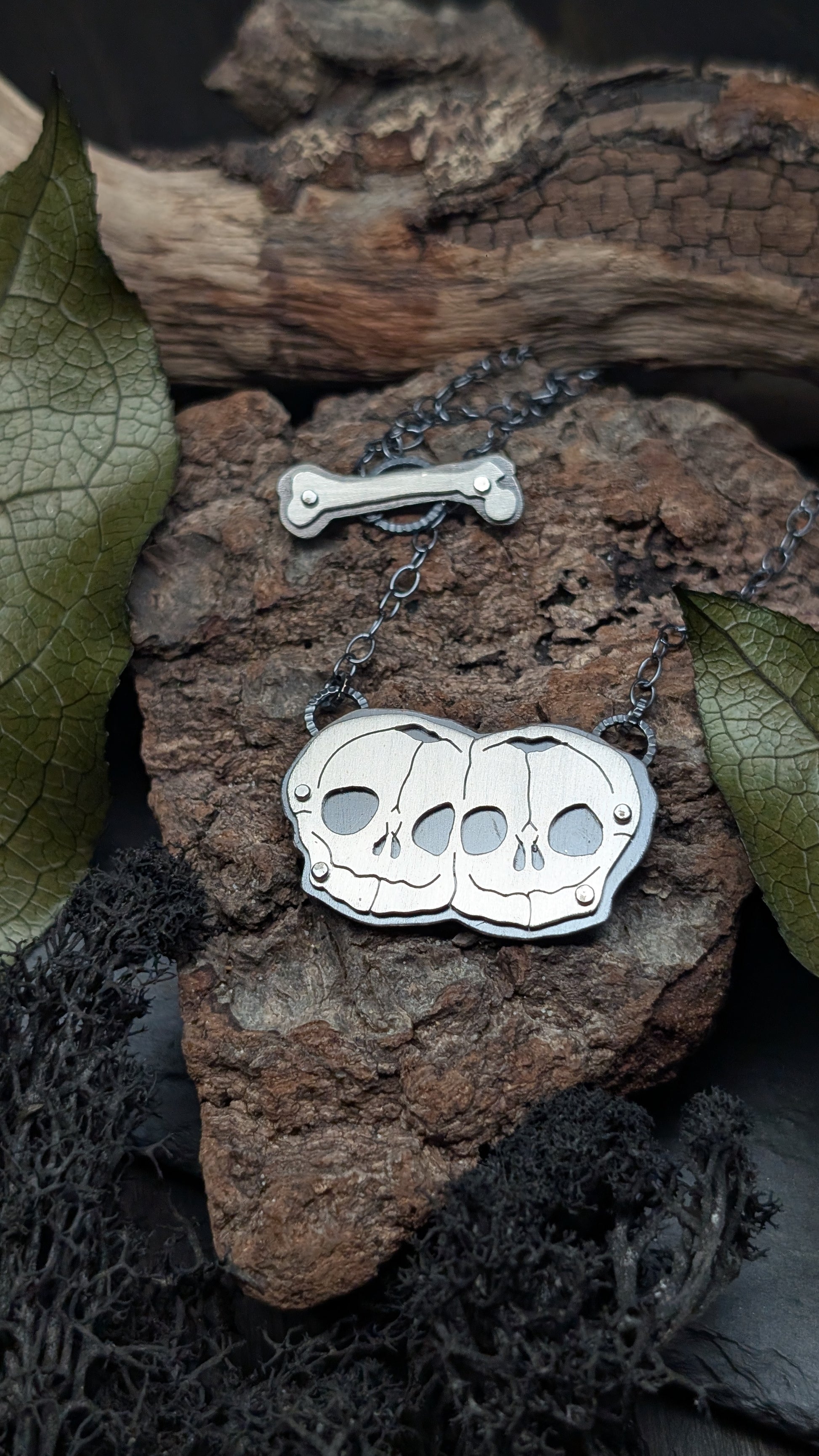 This conjoined twins skull necklace is perfect for any oddities collector or lover of things weird! The top layer is hand sawn out and given a brushed metal finish. The second layer is hand sawn out and oxidized to make the details pop. Fine silver balled up rivets hold the two layers together. The final touch is hand burnished edges add a pop of shine.