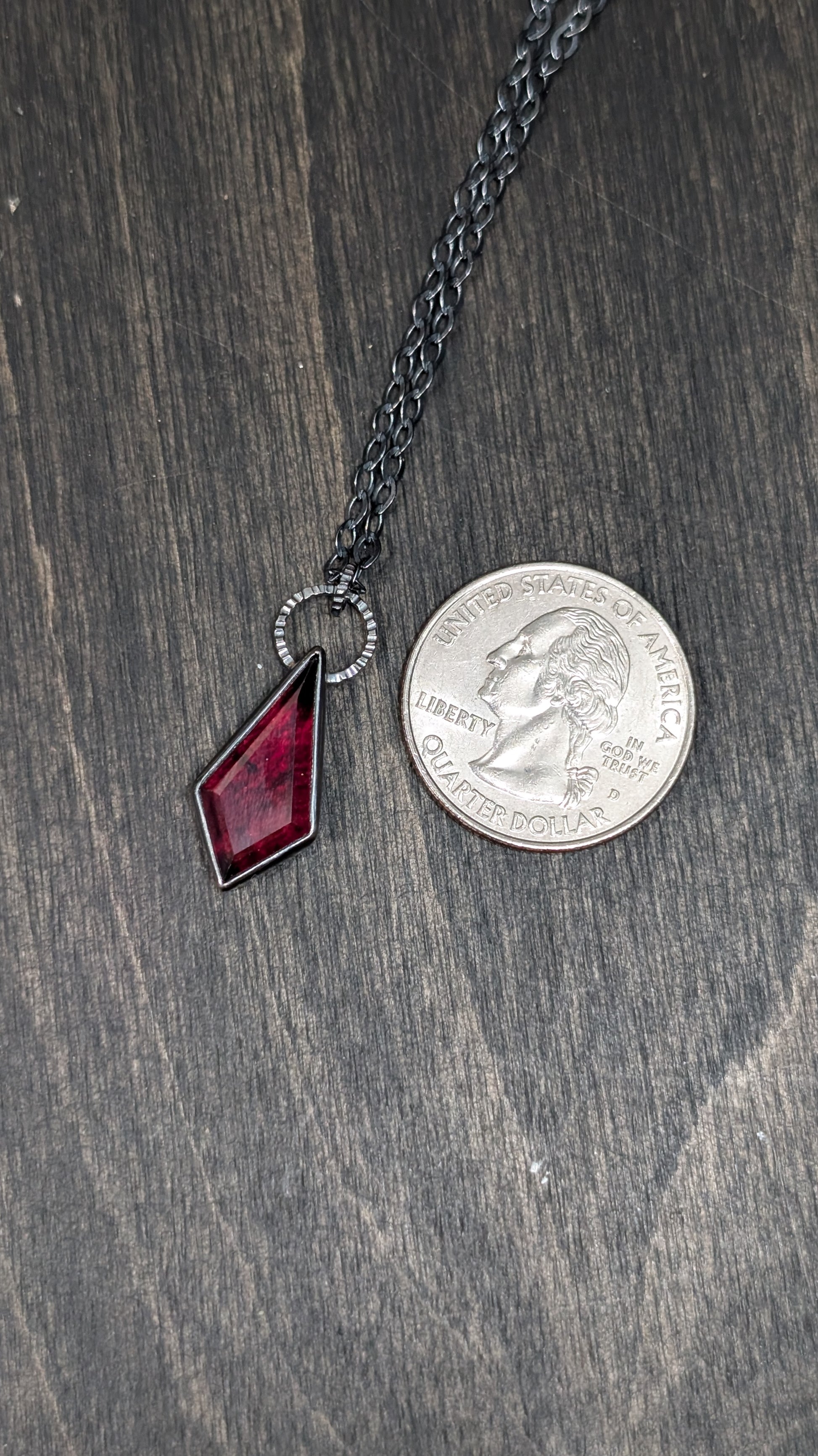 This garnet is bezel set in a oxidized sterling silver handmade setting with a sterling silver carved loop and jumpring. It hangs on a 16-18in sterling silver chain!