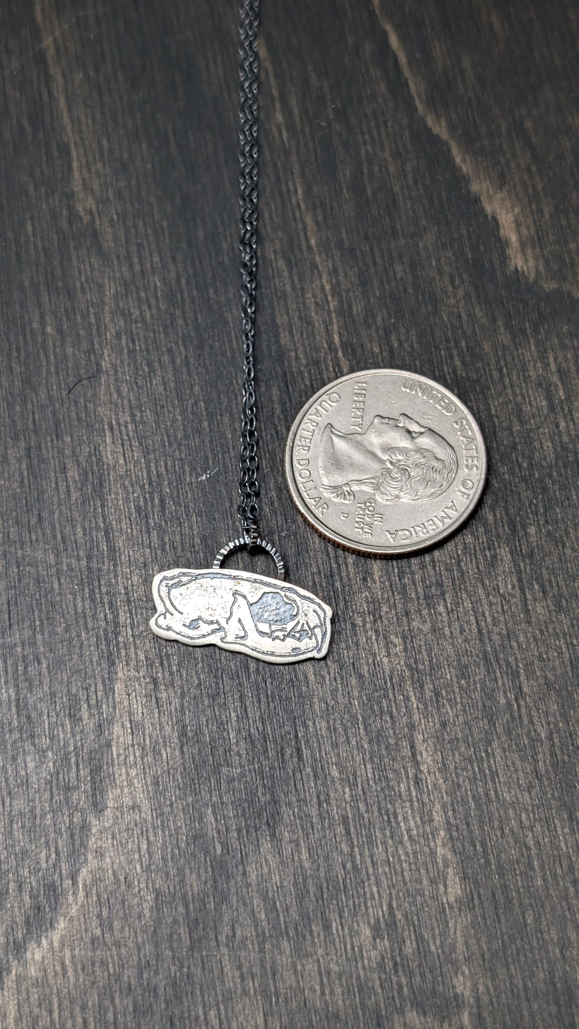 This Mink skull necklace is perfect for any oddities collector or lover of things weird! The skull drawing is acid etched into the silver. It is then oxidized and brushed to make the image pop! It hangs on oxidized hand textured rings and oxidized 16-18in sterling silver chain with handmade s hook clasp.