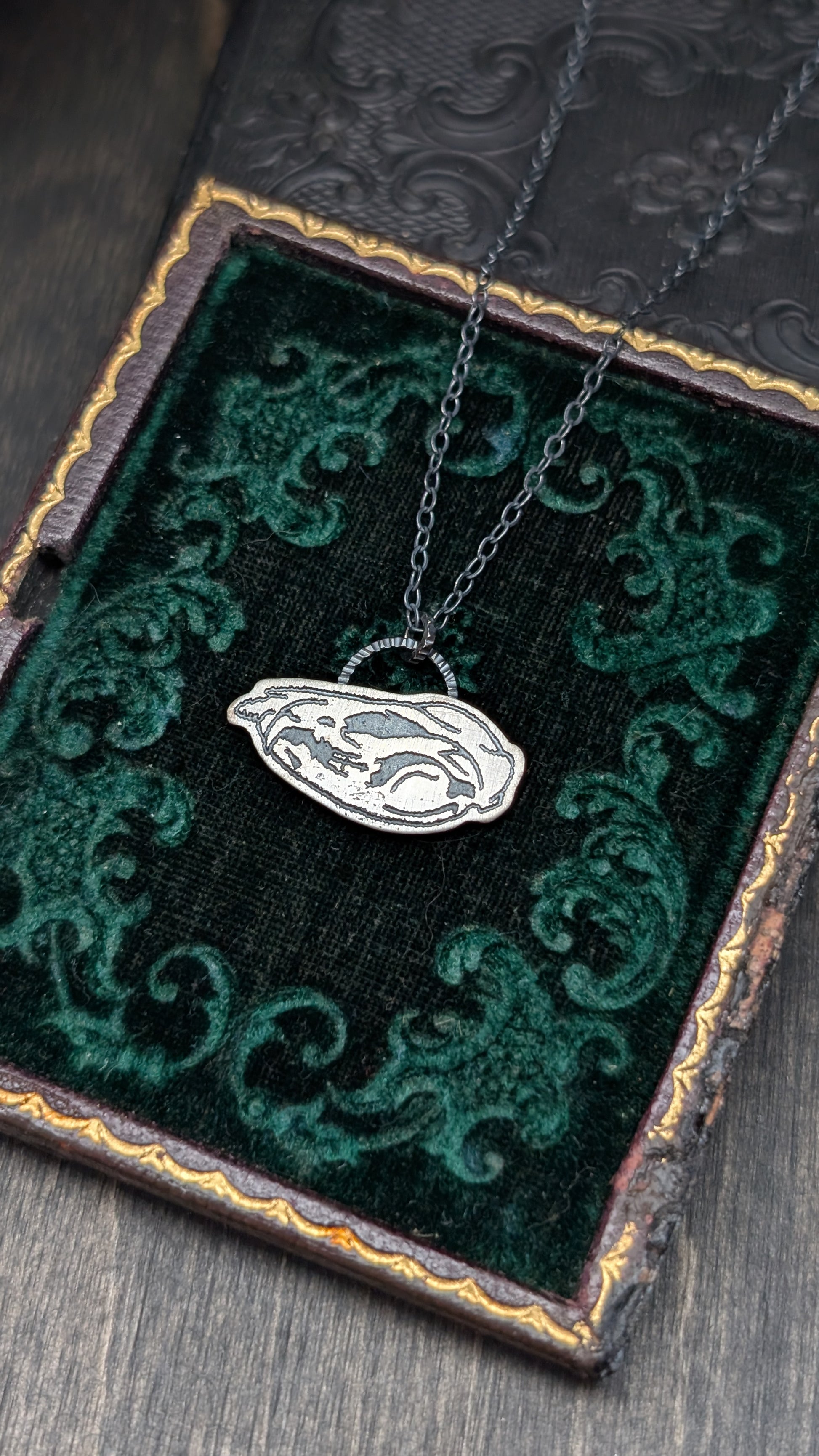 This Opossum skull necklace is perfect for any oddities collector or lover of things weird! The skull drawing is acid etched into the silver. It is then oxidized and brushed to make the image pop! It hangs on oxidized hand textured rings and oxidized 16-18in sterling silver chain with handmade s hook clasp.