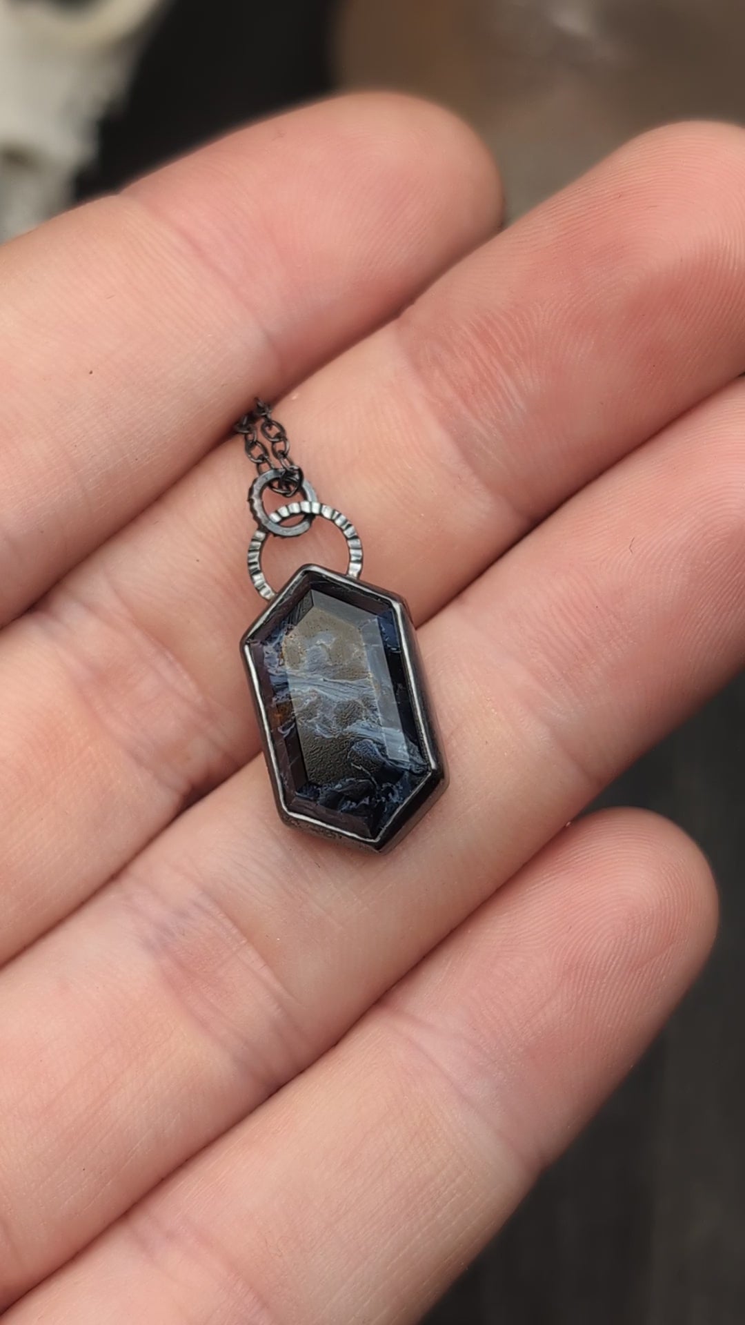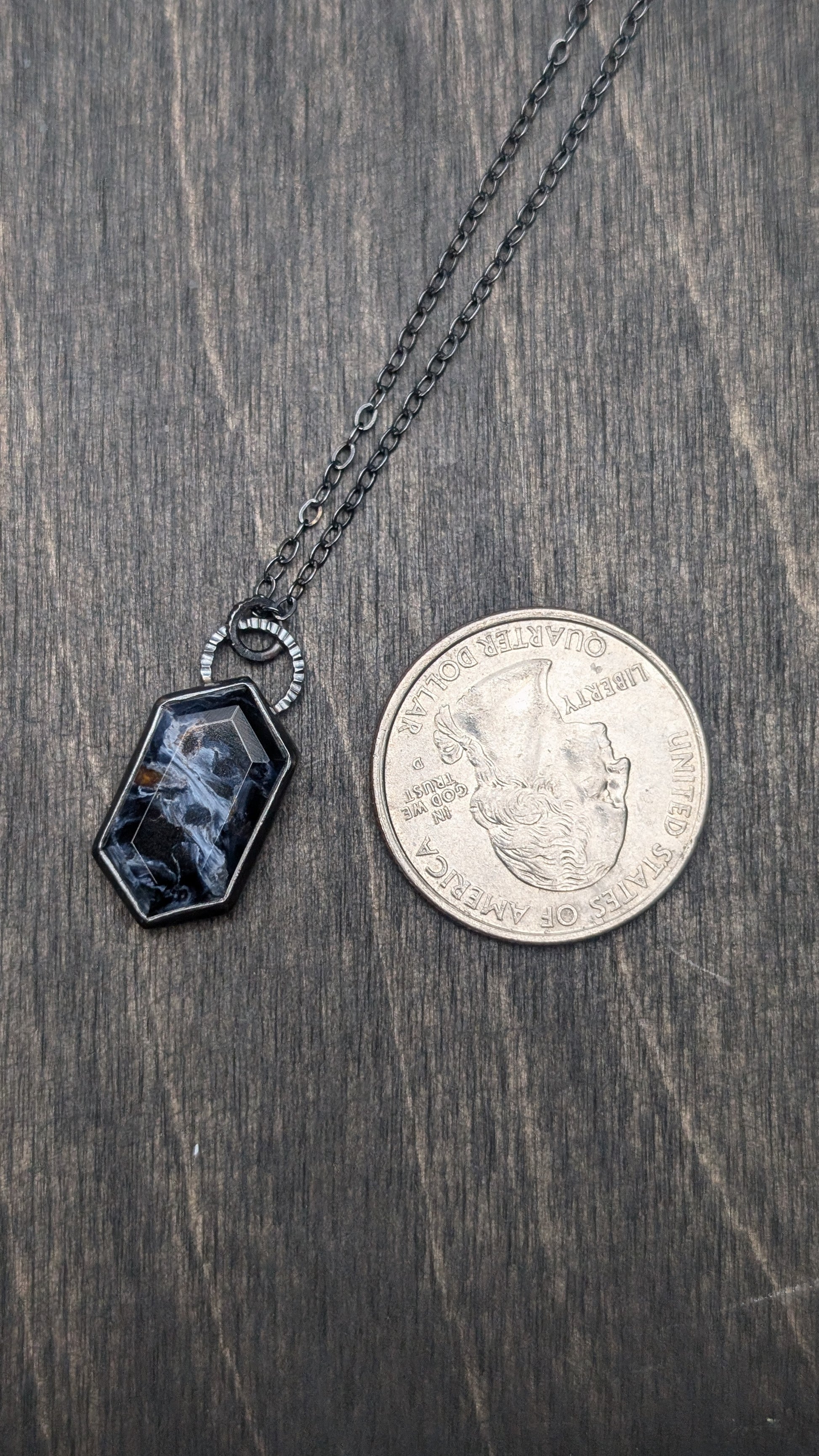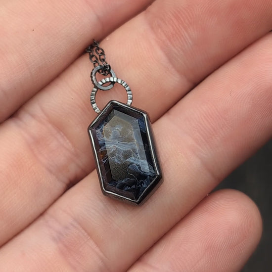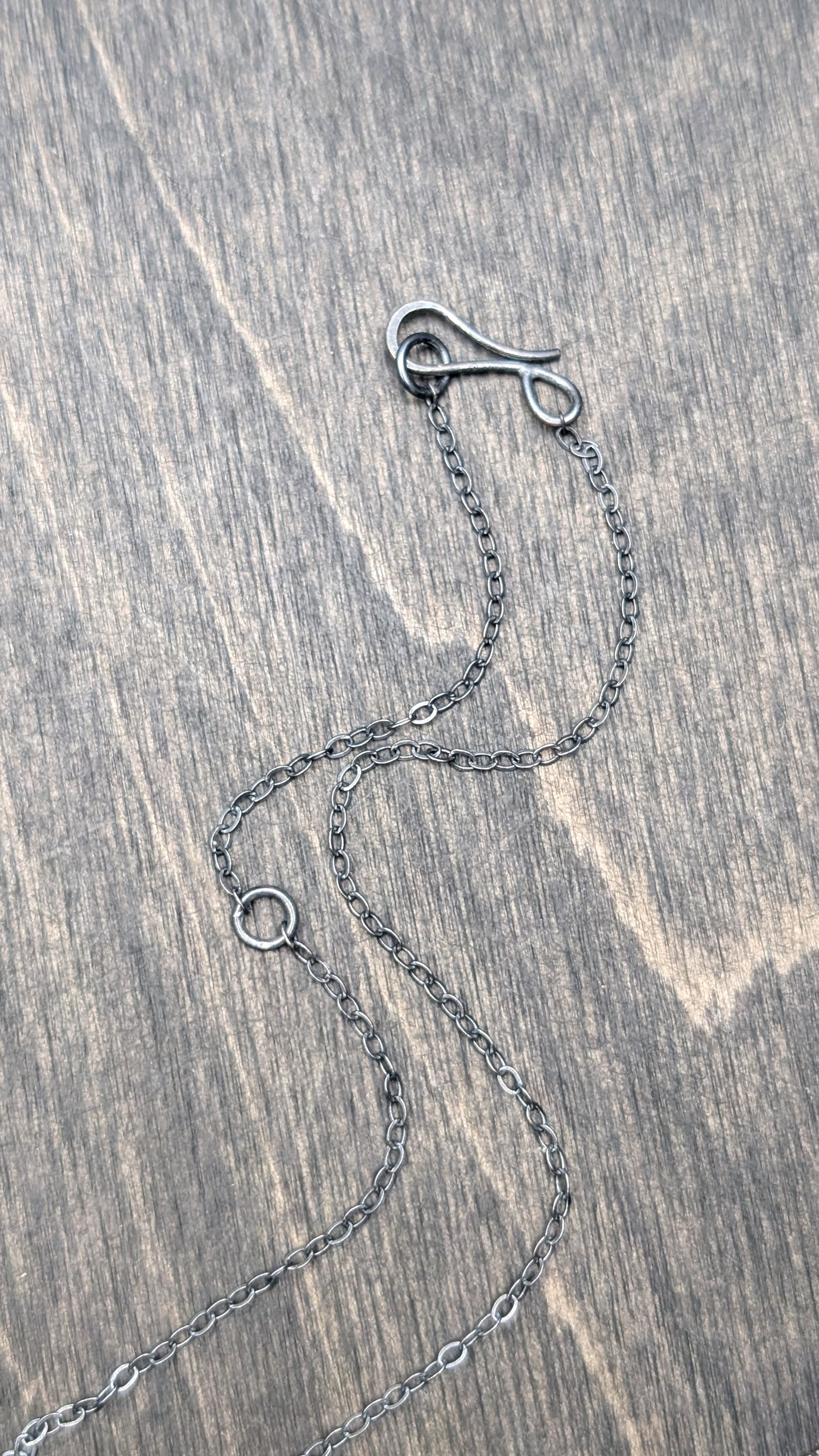 This Pietersite is bezel set in sterling silver and has a sterling silver carved loop and jump ring. The Silver has been oxidized and given a shiny gunmetal like finish. As you wear it the silver will start to reveal itself giving it an antiqued look! It hangs on a 18-20in chain!