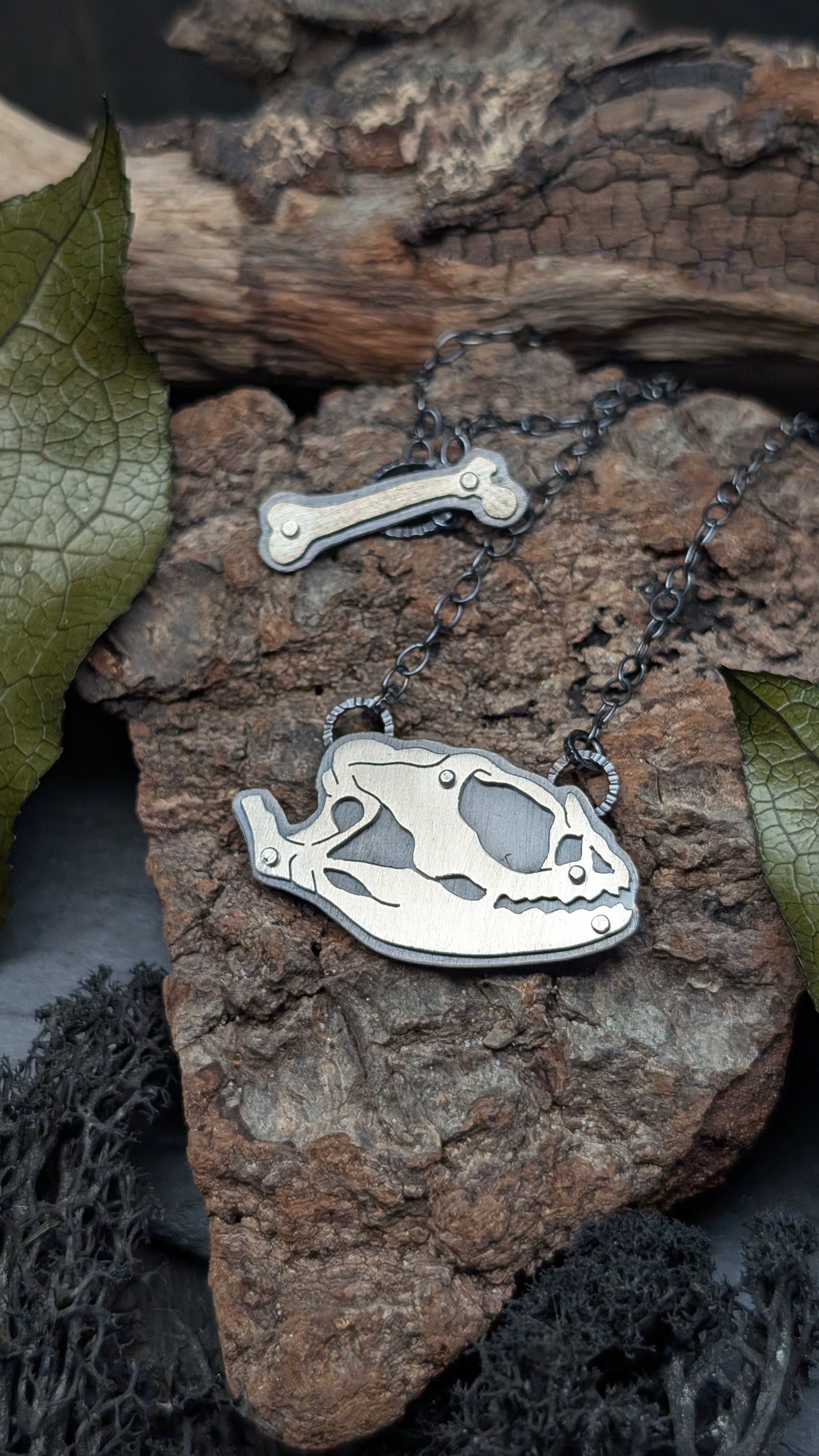 This bearded dragon skull necklace is perfect for any oddities collector or lover of things weird! The top layer is hand sawn out and given a brushed metal finish. The second layer is hand sawn out and oxidized to make the details pop. Fine silver balled up rivets hold the two layers together. The final touch is hand burnished edges add a pop of shine.