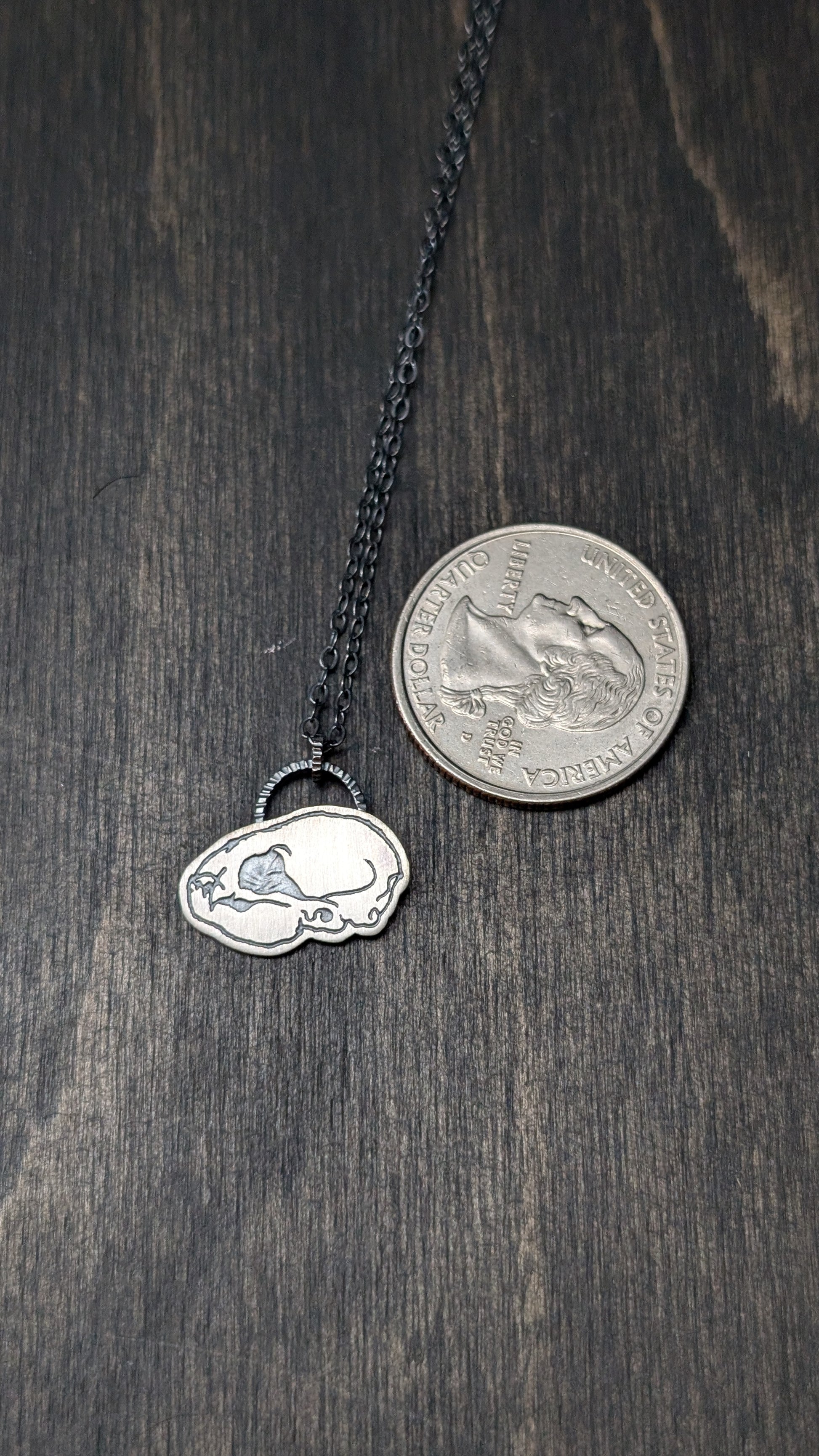 This vampire bat skull necklace is perfect for any oddities collector or lover of things weird! The skull drawing is acid etched into the silver. It is then oxidized and brushed to make the image pop! It hangs on oxidized hand textured rings and oxidized 16-18in sterling silver chain with handmade s hook clasp.